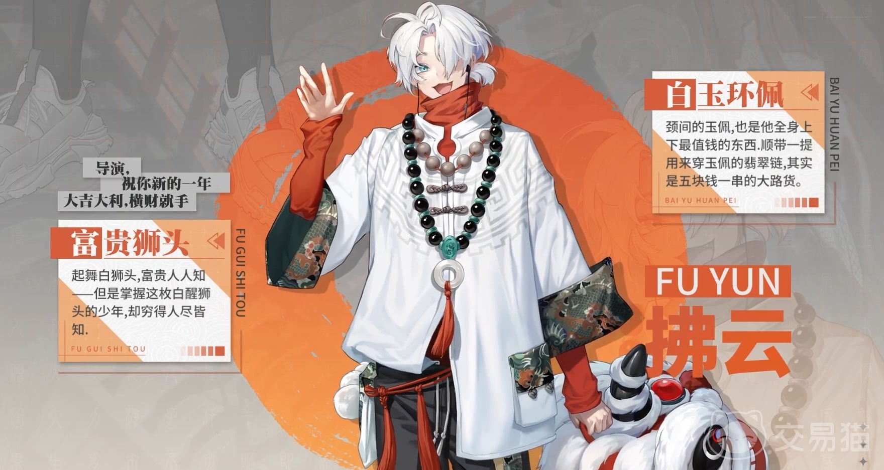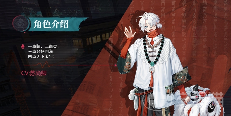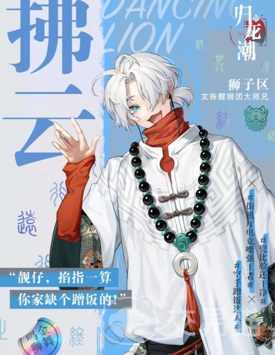 他是文殊醒师团的大师兄,也是狮子区当中赫赫有名的白狮王。这一点从他立绘当中手持的舞狮头套可以看得出来,并且他还是整个醒狮团的掌门人,按照背景故事来说,非常的富贵,具有相当多的财富。不过与背景不符的是,角色本身却相当的乐天派,并且对于身上富贵这点完全没有认知,不知道该如何使用这些钱财。