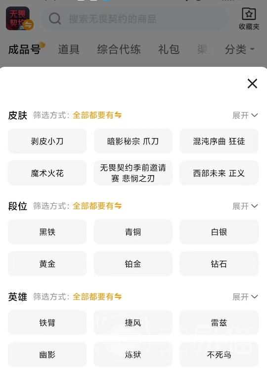 如果说只是想知道皮肤价格高低然后去入手账号的话,交易猫内的商品足够让你琳琅满目,从超凡神话再到白银黄金各个段位的账号都有,且皮肤数量有几个的也有几十个的,很多稀缺的冠军套账号在此也只不过需要几百块左右,而这些皮肤的原始价格在官方上一个就要上百块,所以说直接买号你能得到最高的性价比,且在无畏契约专区内能挑选的数量真的很多。
