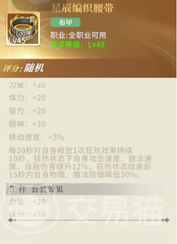 “星辰编织腰带”这个装备在属性方面是非常全面的,可以提供力量,之力,体力,还有精神方面的属性加持,所以不论朋友们选择的是那个职业来战斗,不论是擅长物理输出,还是魔法输出的角色,都能够在这个装备的加持之下得到不小的收益,而且在移动速度方面也有3%的加成,这是不是十分的全能。