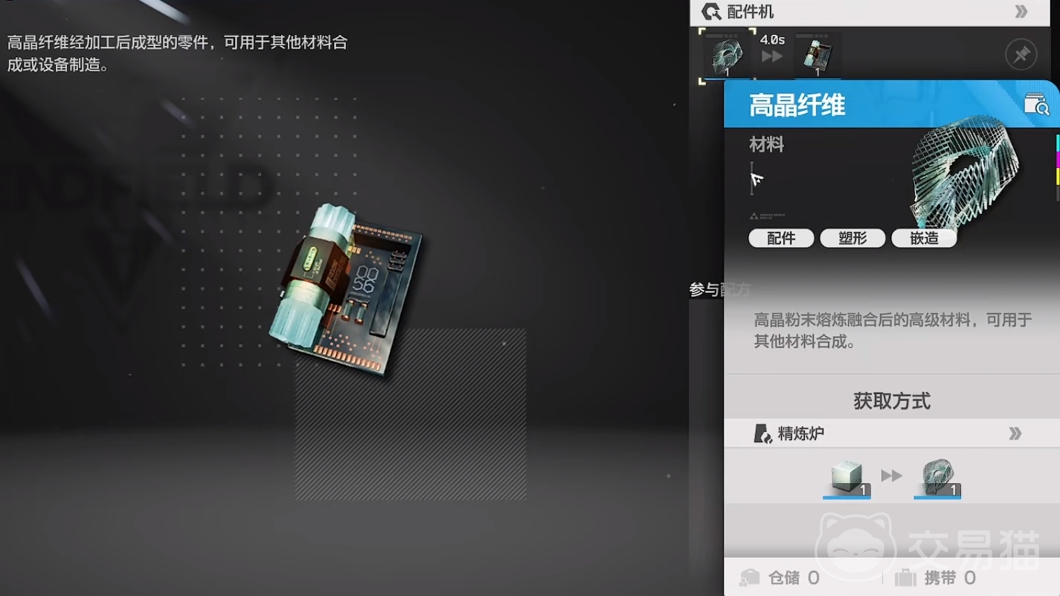 生产装备所需要的素材基本都能通过游戏获得,但自然素材都需要通过再加工,才能得到玩家所需要零件。以高晶零件为例,玩家先要将类晶石精炼成类晶纤维,然后将类晶纤维粉碎成类晶粉末,再将后者进一步研磨成高晶粉末,从而才能熔炼出高晶纤维,最终加工出高晶零件。