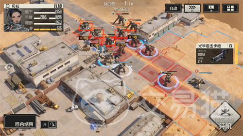 第二回合,赛文继续使用架枪技能,消灭左边的狙击手。波奇则移动到艾莉的旁边,使用修理技能,恢复艾莉的损坏部位。艾莉和卡尔则向右移动,接近敌方首领。