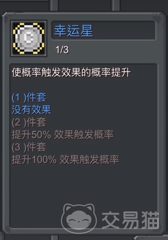 效果为使概率触发的效果概率提升,在三件套满足之后,可以提升100%的效率触发概率,表面上可以直接作用于一些特殊效果以及一些其他概率加成的能力,例如,提高我们的药水加成,以及一些概率加成的伤害。实际情况下,也有玩家们发现,他可能还拥有着隐藏效果,比如增加我们装备以及卡片获取的爆率。