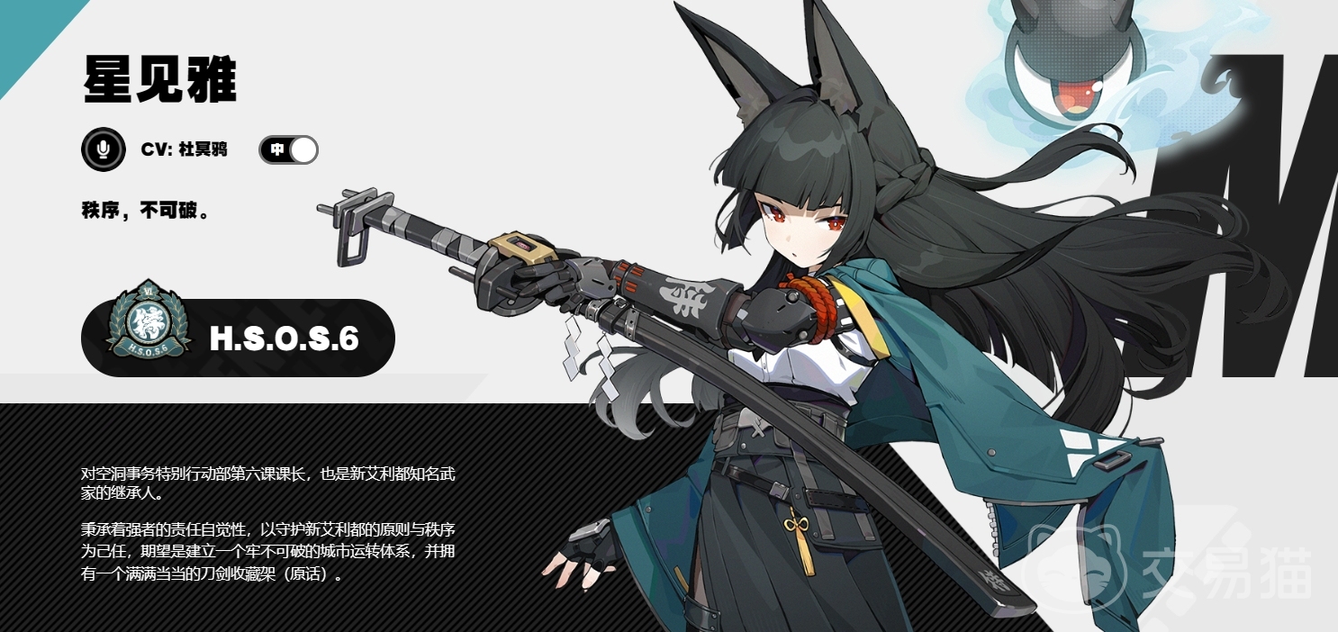 最后来谈一谈角色本身,作为游戏当中少有的以太刀为武器,以狐狸为原型设计的角色,是对空洞特别行动部第六科的科长,常活跃在空洞的一线,拥有极强的实力和高冷的性格。在测试当中也有着不错的手感以及技能演出动画,很推荐各位日后作为开荒以及养成的主力人物。
