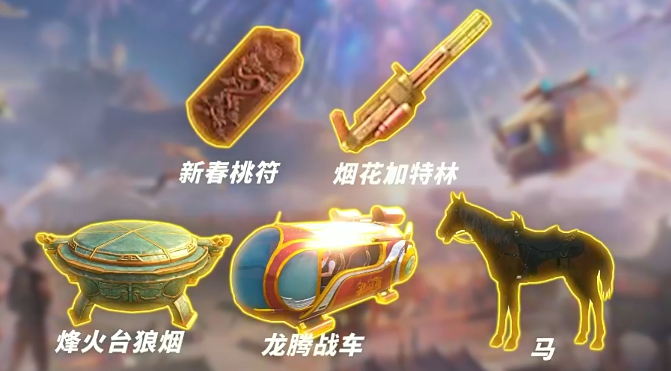 同时,游戏新版本当中还加入了全新的道具和全新的载具。分别是烟花加特林、新春桃符、烽火台狼烟、龙腾战车以及万众期待的马儿。烟花加特林使用之后可以回复健康值和能量值,新春桃符,则是可以回复自己以及周围队友的健康值。烽火台狼烟放置之后,玩家们可以获得一股上升气流,漂浮到空中,并用降落伞滑行。龙腾战车则是一款悬浮车,能够四人乘坐,并且可以用技能飞起滑行。最后就是马儿,撞人有伤害,还能跳跃和骑射。