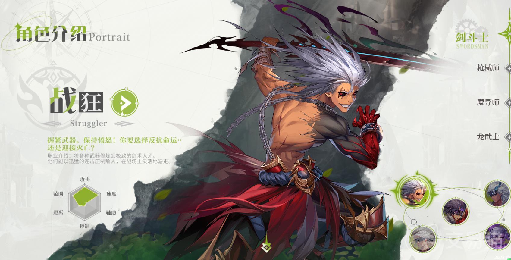 战狂:这个职业是目前剑斗士转职选择最多的,他攻击能力强,爆发力高伤害范围广,速度也是不错的,也有少量的控制技能。他的各方面能力都是均衡的,最重要的是上手难度不高,手残党的福音。想要玩输出又怕不会操作那么这个职业是你最佳的选择。