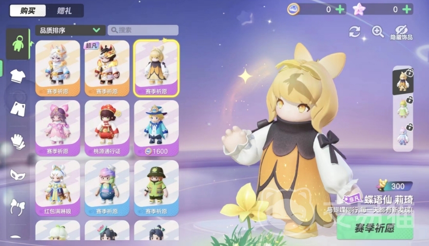 第二类服就是非凡品质的皮肤,其中“蝶语仙·莉琦”就是很好的一个代表,她同样也有着登场特效,在具体的形象上采用与大自然接轨的主题,服装角色的眼神明亮,并且举手投足间都可以绽放花朵和星星的特效,相比起前两款臻藏品质的炫酷风格,它的风格会显得更加轻柔一些,而且在形象上也会十分偏向女性化,如果你喜欢这种轻柔女性化的风格那么可以尝试入手。