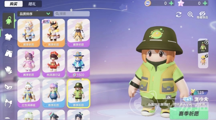 然后再低一档就是稀有品质的时装,这里拿两个时装举例,第一个是“渔小夫”,它通过名字和形象很容易让人联想到渔夫,首先头上是一顶有小鱼标志的渔夫帽,然后身上的绿色衣服和裤子也都很简单干练,同时在皮肤名字下面的介绍也轻而易举的让人联想出一段渔夫钓鱼钓到异世界的幻想故事,不过比较遗憾的是这类时装都没有登场特效。