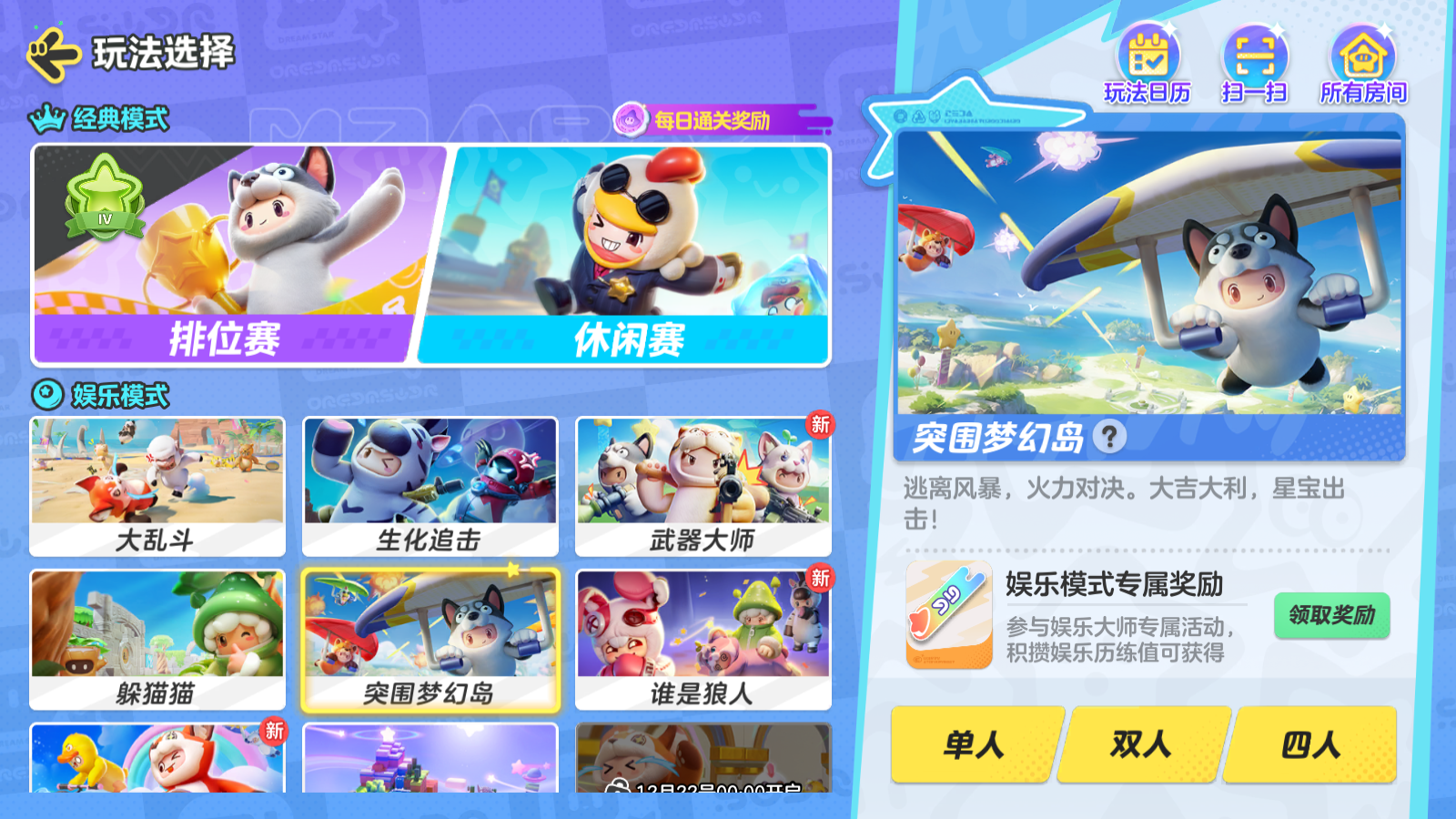 目前实装了超多有趣的玩法模式,例如新实装的突围梦幻岛,这是一种类似吃鸡的玩法,一般只需7到10分钟一局,通过在场景内搜索强力的道具、武器、投掷物、补给来提升自己的战力。该模式既可以单排也可以双排或者四人组队开黑,其乐无穷。