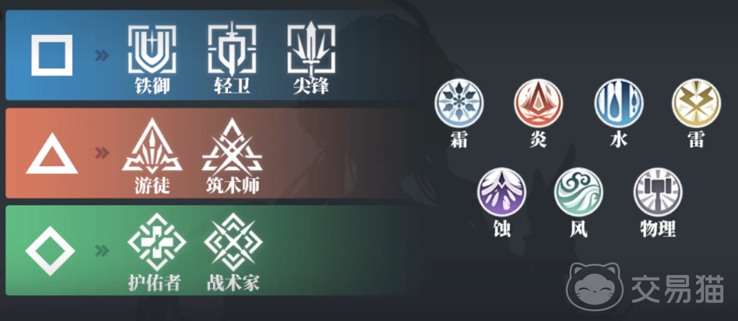 本作当中,直到目前为止,总共有着七种不同的属性和职业。分别为霜、炎,水、雷、蚀、风和物理。其中,蚀、风和物理这三种属性,不会参与到具体的元素反应当中,属于自成一派。风属性,还能对于空中单位造成额外的伤害,并且能吹散雾气。