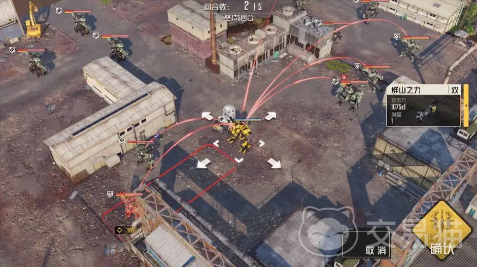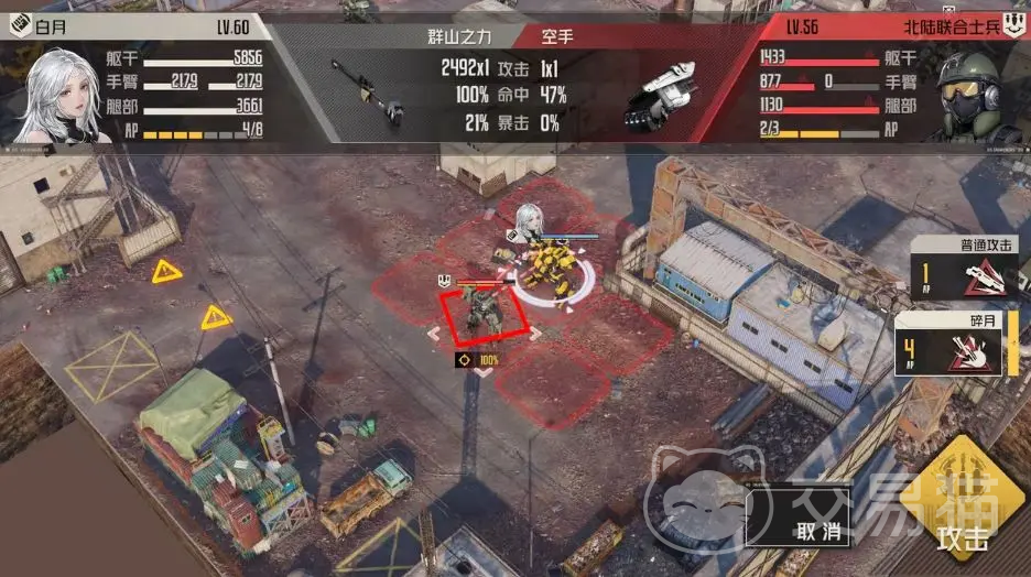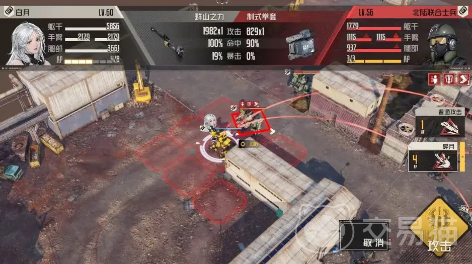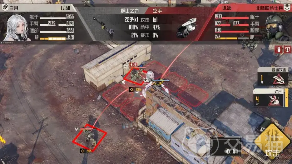 第一回合:可以参考一下图中,这一关是需要不仅导弹兵攻击,不是仅仅不挨导弹而已,如果被导弹兵用头创了,也是相当于成就没有完成的。第一回合需要做的第一步,可以参考图中去走,到了位置之后,先利用普通攻击近距离作战,然后在准备谋而后动;在这一关的时候,尽量不要站在对手容易反击的位置,在这个位置动手身体部位容易掉。第一回合的第二部的时候,等摸完格斗兵之后在进行,利用碎月的技能直接将右侧的狙击兵的头给敲掉。
