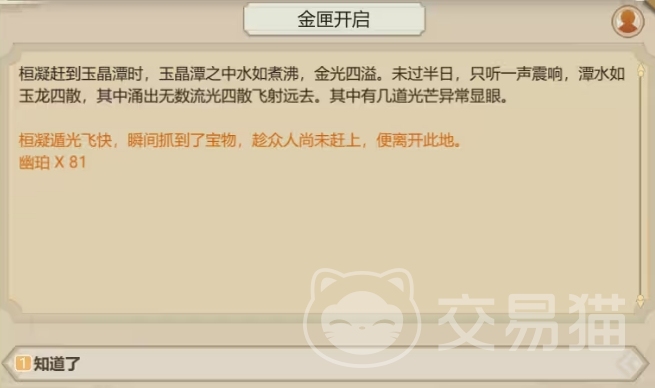 在第五个选项中大家就可以获取81枚幽珀,其实这个选项是比较吃亏的,因为这个道具在游戏中其实获取的途径还是有很多的,所以不建议大家选择,而最后一个选项最好不要碰,一般选择最后一个选项的玩家什么都得不到就会离开玉晶谭,所以大家可以根据自己的需求在上面五个选项中选择自己想要的奖励哦。