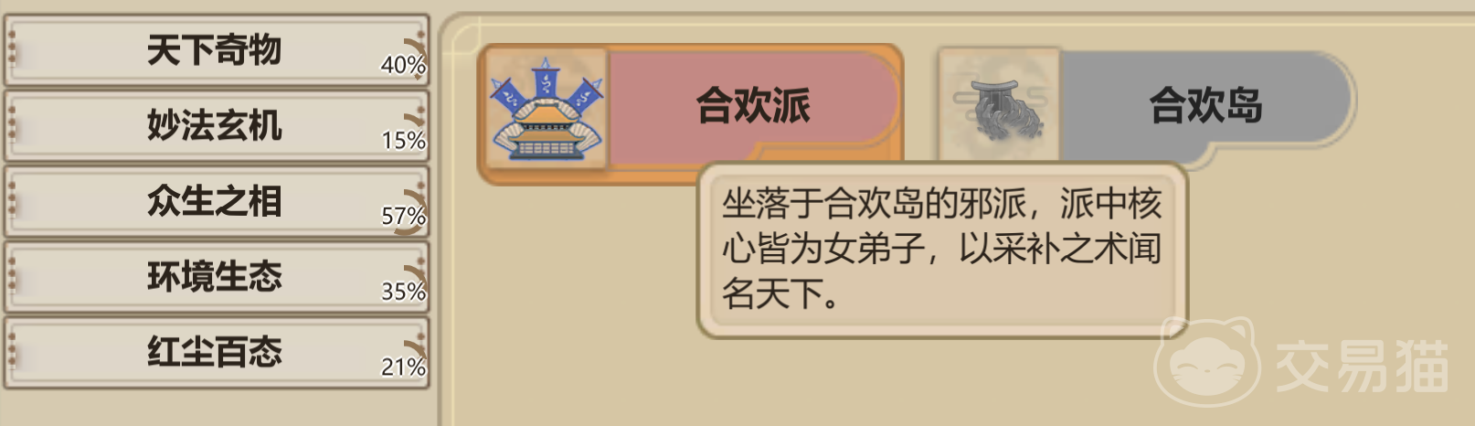 了不起的修仙模拟器合欢宗功法的主要玩法就介绍到这了,这是一个以情感为核心的门派,可以通过与其他修仙者建立各种关系,提升自身的修为。合欢宗的镇派法宝是合欢铃,后期炼器做狗粮也是个不错的模板选择。