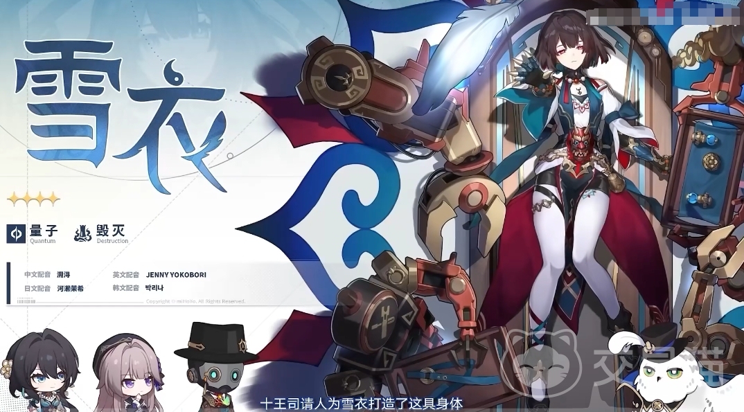 第二份喜角色是雪衣,这是一个四星级的女角色,在游戏中的身份定位其实是判官之一,在出场的时候其实一般手上都会拿着铁索,在剧情中其实也是一个比较冷情的角色,一般出现的时候都是战斗场面,也是一个猛女,伤害数值还可以,也有一定的控制。