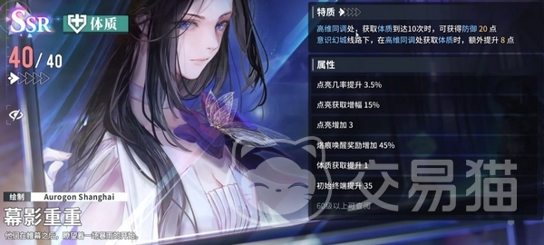 SSR级里的“残照”是给弱点标记,可以降低目标的元素抗性,触发弱点的时候有额外的元素伤害,适合元素队。“偷偷摩摩”则是自愈,在自身回复的时候每20秒提升激励。“天陷”则是到炽热光环,每秒造成体质数值百分比的物理范围伤害,适合体质队。“同行”,在体质达到1千以上的时候自身回复的时候加攻击加暴伤,也适合体质队。