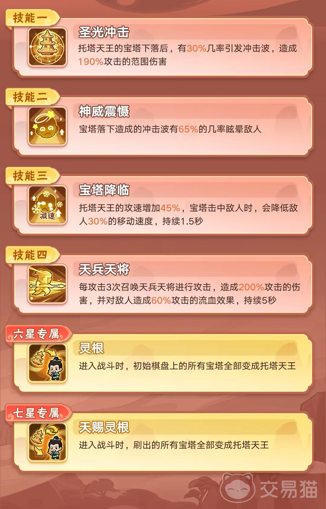 首先要知道这款游戏是一款非常好玩的休闲娱乐塔牌塔防类游戏,在游戏当中玩家们可以看见葫芦娃这个动漫当中的一些经典形象人物,这些经典形象人物在游戏当中都摇身一变化成了英雄角色,让玩家们挑选并且使用他们进行上场作战,在此基础上还新增加了一些新的角色在游戏里面跟大家见面,而塔防类游戏考验的就是玩家们对整个游戏整个局面的把控能力和策划能力,本期主人公托塔天王在游戏当中的定位是辅助,但是他的技能却是拥有群攻技能和眩晕控制技能以及流血技能,是一个全方面十分不错值得入手的角色。