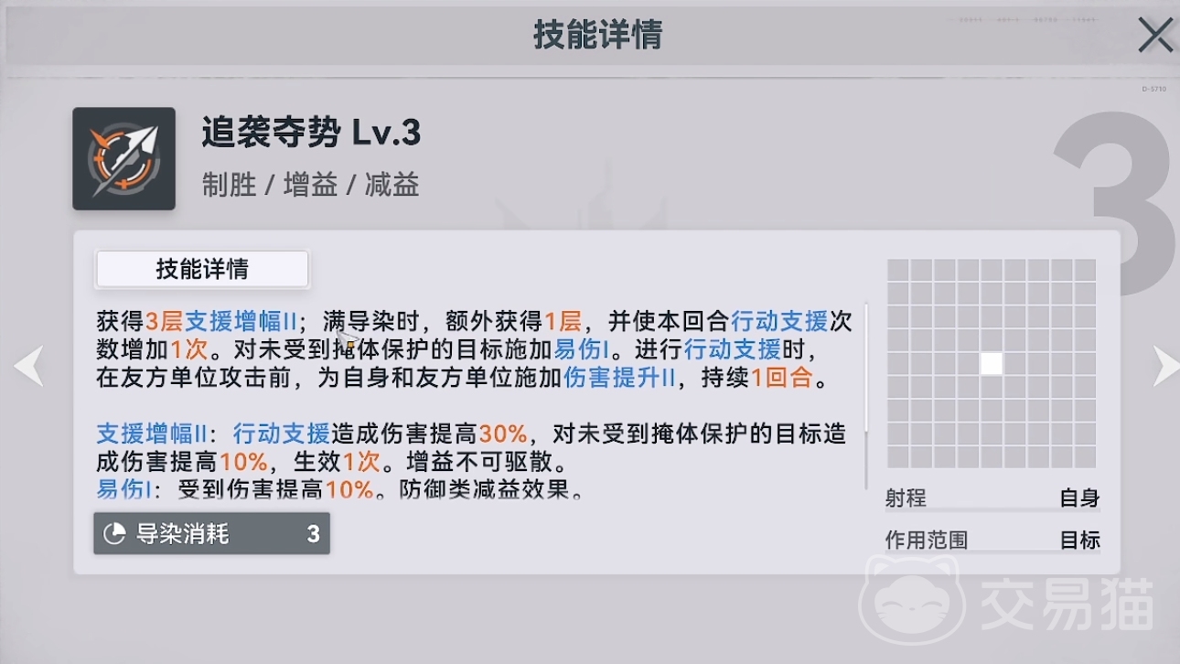 琼玖的爆发能力非常高,其技能均为单体,并且能为自身的输出附带一定的增益效果。其中,琼玖的大招追袭夺势在释放能为她提供三层的支援增幅,满导染的情况下还能再获得一层,并且还具备着给未被掩体保护的敌方施加易伤buff,为所有友军带来伤害提升的增益。同时,在琼玖释放大招后,只要友军攻击的目标在琼玖的攻击范围内,那么在敌方受击后琼玖还会再向该敌人进行一次攻击。
