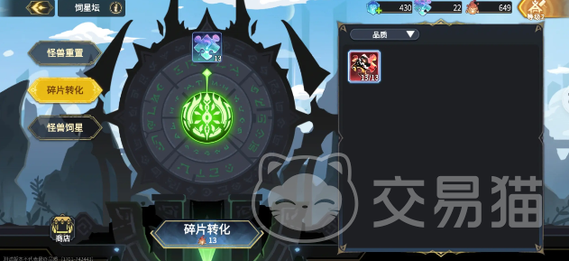 饲星坛的玩法并没有大家想象的复杂,不过这里也应该知道怪兽重置就需要使用大概100钻石,此时可以返还怪兽的经验,可是却没有办法获得金币。第2个是通过碎片转换可以直接用觉醒怪碎片转换成万能碎片,只是在每一次转换时都需要额外的消耗30饲星魂的。