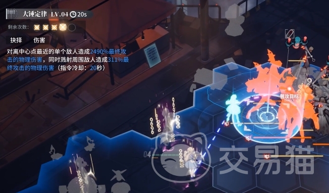 技能方面她主要有三个,第一个是“大锤定律”,可以对范围中心的单体敌人造成拥有超高加成的物理伤害,并且其周围的敌人也会受到311%的溅射伤害,这一技能兼具单体爆发与AOE能力,非常全面。