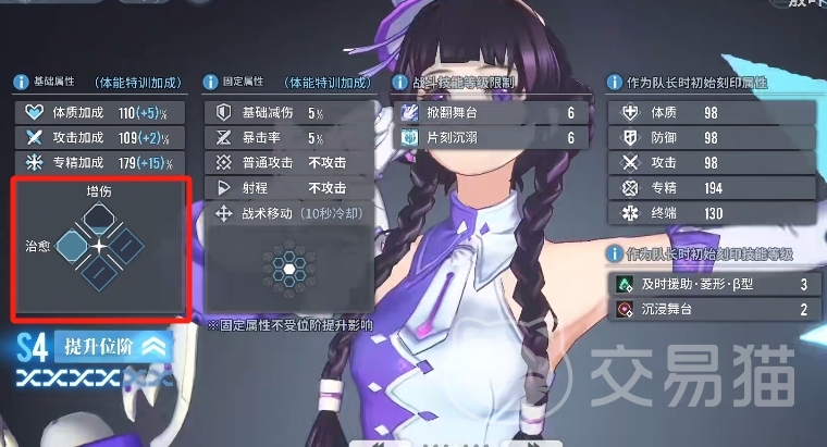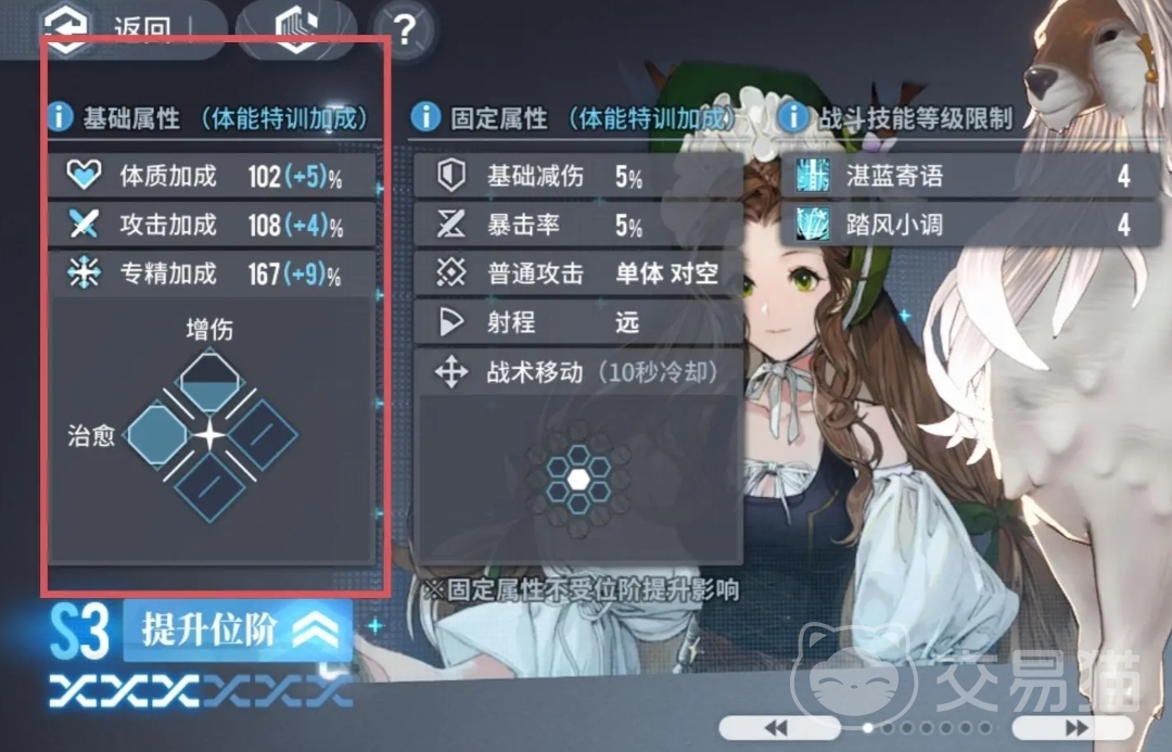 相比之下角色自身的专精会更加复杂一些,因为每个角色所擅长的方向都是不一样的,一般在专精加成下方都会有一个图形,这个图形中有亮色的区域就代表该角色的擅长项,比如下图这个角色她擅长治愈和增伤,那么在提升她的专精属性时,其治愈和增伤的效果就会进一步加强。