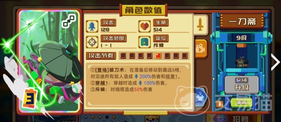 一刀斋:他同样是一个近战角色,其攻击与生命要比雷神将更加出色,不过这与其高达彩色的品质是脱不了关系的,作为彩色角色,它的技能则主要有三个,登场触发的是“拔刀术”,可以对前方五格的敌人造成200%攻击力的伤害和一定时间的眩晕,并且这个过程会附带一个位移动作,因此他可以更好的接近敌人后排。