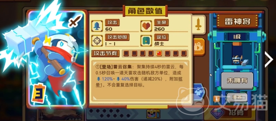 雷神将:这是一个定位战士的近战输出角色,60的攻击和260的生命都显得十分不错,而且这还只是一级的基础数值,经过培养后他的潜力会变现的更高,此外,其攻击节奏也比较不错,虽然算不上很快,但却往往能够在关键节点给予敌人致命打击。