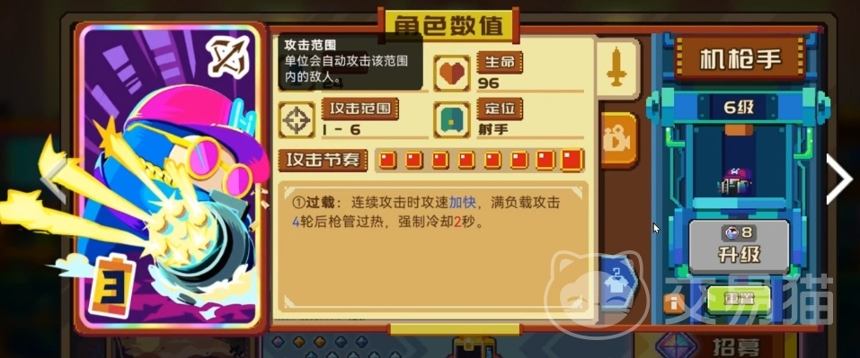 机枪手:他是游戏中位数不多的射手类角色,其攻击范围最高可到6格,并且攻击与生命在后排中都排的上号,技能的话则比较简单,只有一个名为“过载”的加速技能,使用后会加快攻速,并且进行4轮的满负责攻击,虽然该技能会导致枪管过热,但却只有2秒冷却。