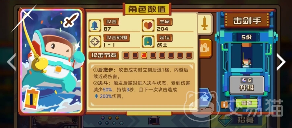 击剑手:这是一个机动性很强的战士角色,其攻击与生命都属于比较靠前的水准,攻击范围不远,但技能附带“后撤步”和“决斗”,前者会在攻击后提供一段位移以此闪避伤害,后者则是利用后撤给予角色决斗状态,以此获取额外的减伤和普攻强化。