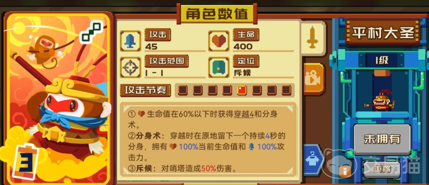 该技能提供的另一个效果是分身术,分身术其实就是平村大圣的第二个技能,不过由于放置推塔游戏的原因,所以玩家在游戏内并没有办法主动释放这一技能,因此往往还需要通过一技能血量降低的条件去触发。