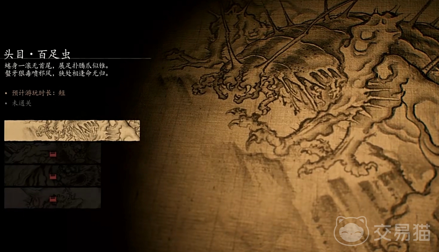 目前该游戏的关卡只有4关,其中前面三关没有单独的关卡标题,都是以它其中的boss作为标题,第一关是“头目·百足虫”,这关一开始玩家会出现在一个山的半山腰处,山上到处都是奇形怪状的石头,所以路途陡峭很不好走,跟着地图上的标识去寻找路线很快就会来到山腰下一篇杂草丛生的草地上,不过草地并不是终点,继续往前走会发现一处断崖,断崖的高度不算高,下方则是一片盆地。