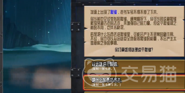 3层专属,能复制1张牌1次或5次,也可以选择不要。值得一提的是,这个事件中的复制,如果是复刻之了带有碎片的卡并不会增加碎片。裂缝是这个游戏中非常厉害的一个事件,如果来得恰到好处直接可以让这一局变成爽局,再不济也可以当做1个复制来用。所以在3层的时候建议将核心卡构筑好,然后看来什么事件。