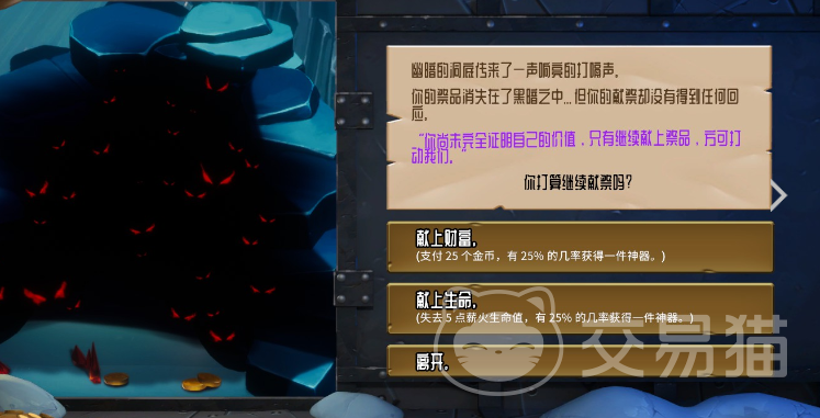给25个硬币,概率获得神器;给生命,概率获得神器。两个事件,一般是选择埋给血,这个游戏的金币更重要,不过如果血在20以下的话则不建议给,直给跳过。