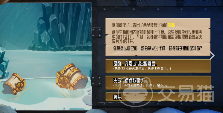 大小宝箱的事件,25血换150金币,或者5血换25金币,看血量多少,血多就多换点金币,血少就换25金币或者直接离开也行。