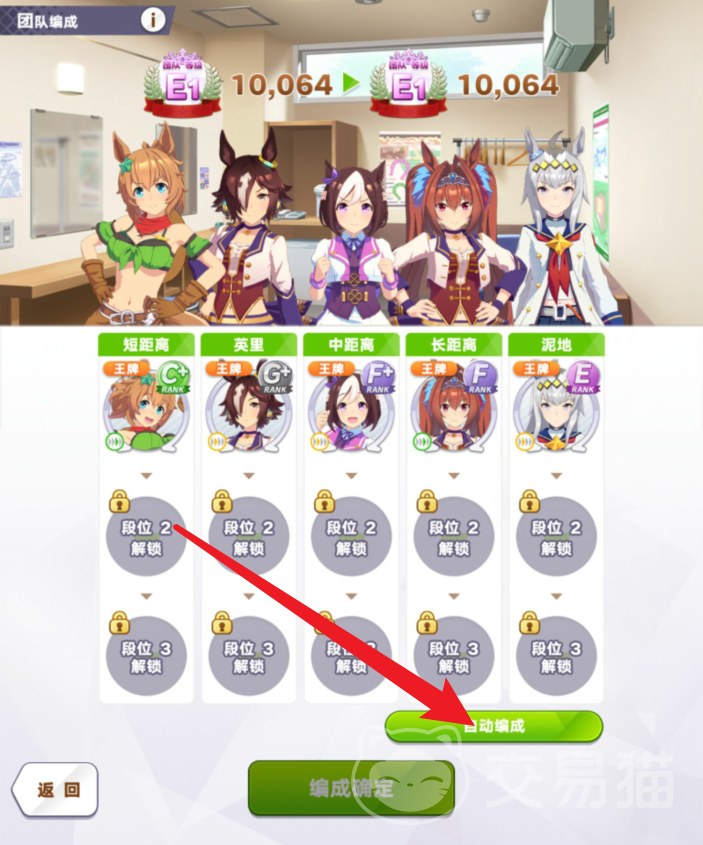 在小伙伴们刚进入游戏的时候,首先在游戏的主界面左上角会显示一个字母,点击就可以进入编队的评价界面了,在初期的时候,小伙伴们只能给自己设置一个编队,所以后面玩家的等级越高,可以设置的编队数量就会越多,每个队伍中每一种跑道都可以专门设置一个马娘。
