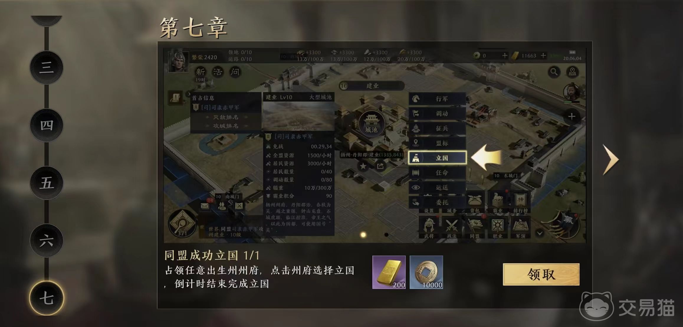 要想立国,首先要加入一个强大且活跃的同盟,然后由盟主来申请进行立国。需要满足两个条件,第1个条件是占领任意一个出生州的州府城池。第2个条件是同盟建筑中同盟大厅要达到三级。满足这两个条件之后,就可以选择在占领的出生中进行立国,操作期间会有倒计时,时间结束后立国完成。拥有自己的国家后可以进行颜色以及国号的选择。