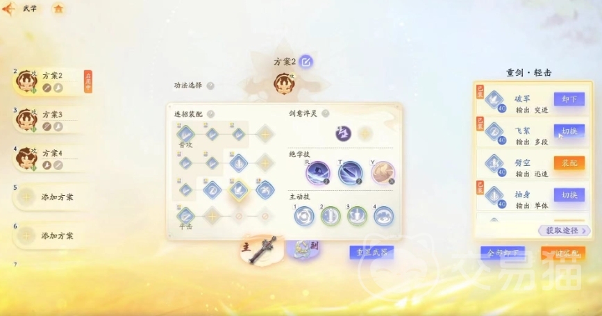 选择好职业之后在武器上面也需要进行搭配,在武功技能方面可以根据职业的需求对不同武器进行升级和锻造,还能对这些武功心法搭配出一套招式,在竞技的时候可以自动释放。职业的选择上还需要不同的侠侍阵容,侠侍需要玩家们在卡池中抽取获得,侠侍还有不同的形态,到达一定等级之后能陪同玩家出现在游戏主界面。
