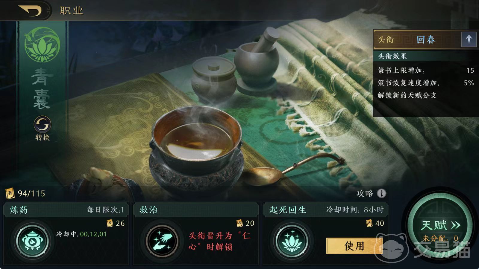青囊职业的取名自然和三国时期著名的医生华佗相关,是目前游戏中最为强大的辅助职业之一。拥有三个不同的天赋,分别是炼药、救治和起死回生。主天赋炼药,能够炼制体力丹药,使用之后增加体力,体力作为游戏中经验获取的重要来源,是所有玩家都需求的道具。青囊炼制出丹药可以自己使用,也可以赠送给朋友,赠送时将获得资源奖励,也能够收获其他玩家的友情。另外还有三个小天赋,分别是精炼、良医和产量,精炼可以提高获得精良产品的概率,良医则是增加赠送时获取的资源产量,产量提高额外获取几率。