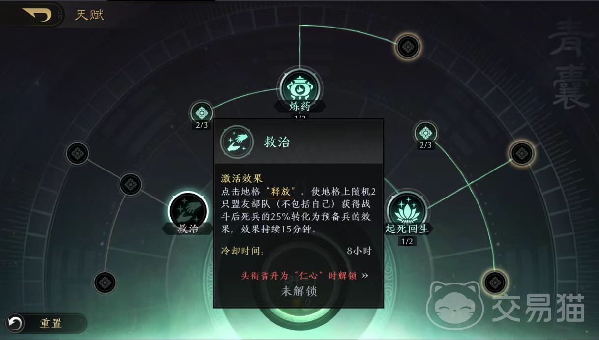主天赋救治,使用时选择一个地块作为释放技能目标,使该地块上随机两只盟友部队已经阵亡的士兵转化为预备兵,持续15分钟。释放时治疗目标不包括自身,该技能最大特点就是能够降低损耗,这样在前期开荒时候,就有更多兵力去攻略土地,自然对发展有着很大的好处,后期团战时也能够提高获胜几率。另外还有三个小天赋,分别是急救、强健和医治,急救降低在pvp战斗中失败后阵亡率,强健是降低在攻打资源地时阵亡率,医治可以延长救治技能的持续时间。