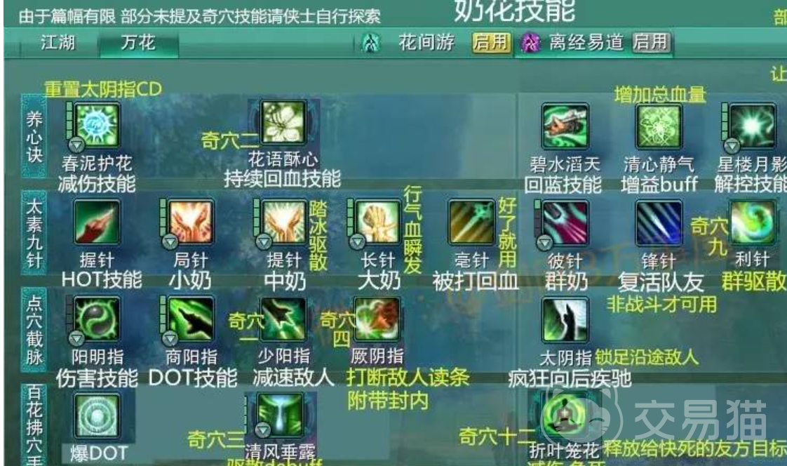 太阴指是该门派少数的团战技能,还具备位移效果,使得万花职业的刷图能力不会太弱,这样才能前中期更好地进行渡过,最后就是驱散技能清风垂露,可以随机解除各种异常状态,比如说阴性不利、混元性不利等效果,对于控制职业有着不错的压制能力。