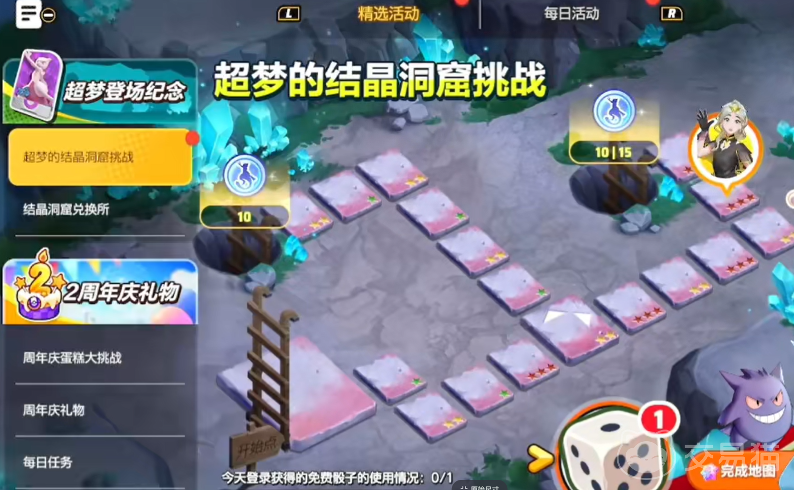 如果大家想要获得“超梦”这个宝可梦的话,是需要参加游戏中的【超梦的结晶洞窟挑战】,这个挑战的话,也是比较简单的,每天登录是可以获得免费的骰子的,这些骰子是需要玩家们去抛出后获得点数!