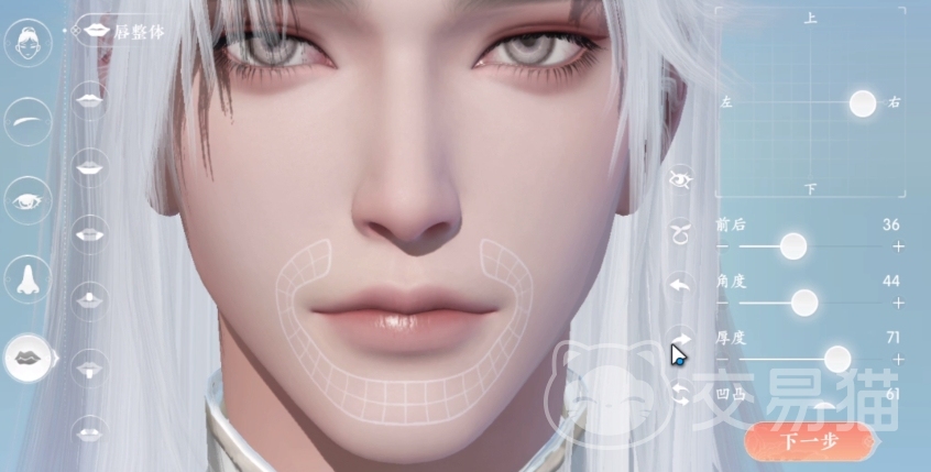 鼻子的话则完全不用改,直接全用默认就好,位置居中,前后,角度,长度和饱满也全用50,最后的嘴唇则需要大改一下,把它的位置调整到偏右,然后剩下四项数据调成“前后36”,“角度44”,“厚度71”和“凹凸61”。