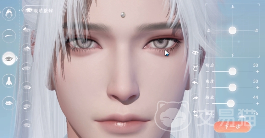 之后就是眼睛,眼睛的上下左右位置也直接用默认的居中即可,前后和角度则调成50,剩下的缩放和眼长则分别调成44和76,这样可以让你角色的眼睛更具有美感。