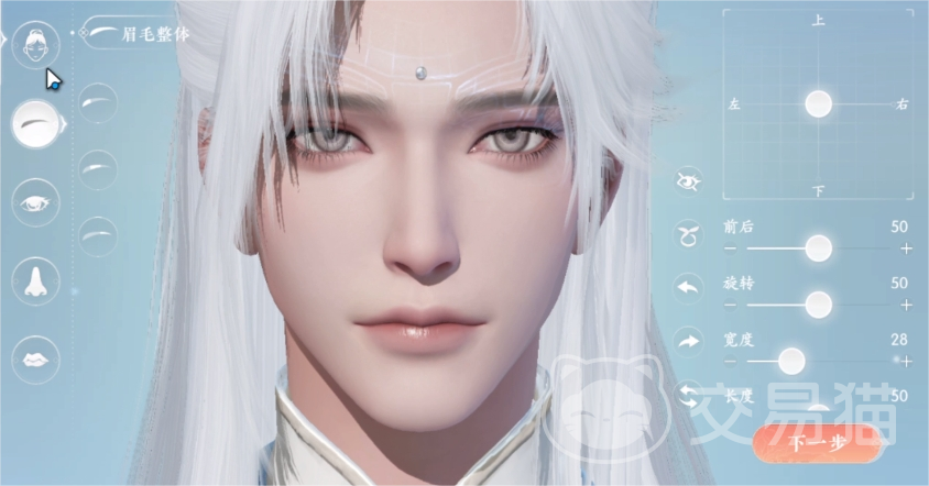 然后眉毛的数据则可以像上图这样去调整,上下左右的位置直接居中即可,然后剩下的四项数据分别调成“前后50”,“旋转50”,“宽度28”和“长度50”,这样的眉毛会让你的角色更加有神。