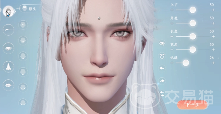 首先第一个要捏的是额头,这里的数据为“上下50”,“角度50”,“长度50”,“宽度50”和“饱满26”,前面四个都是用的默认的数据,因为这样是最协调的,最后一个饱满调成26会让角色的额头稍微显瘦一些。