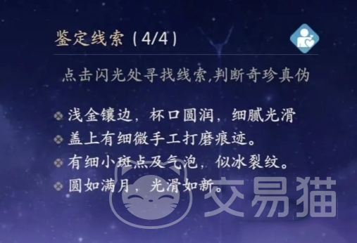 鉴定的藏品不同右上角给小伙伴们弹出的提示也不一样,小伙伴们只需要按照提示所说的线索去点击藏品闪光的一些地方就可以了,之后就可以出现一些线索提供给小伙伴们去判断这个藏品的真假。