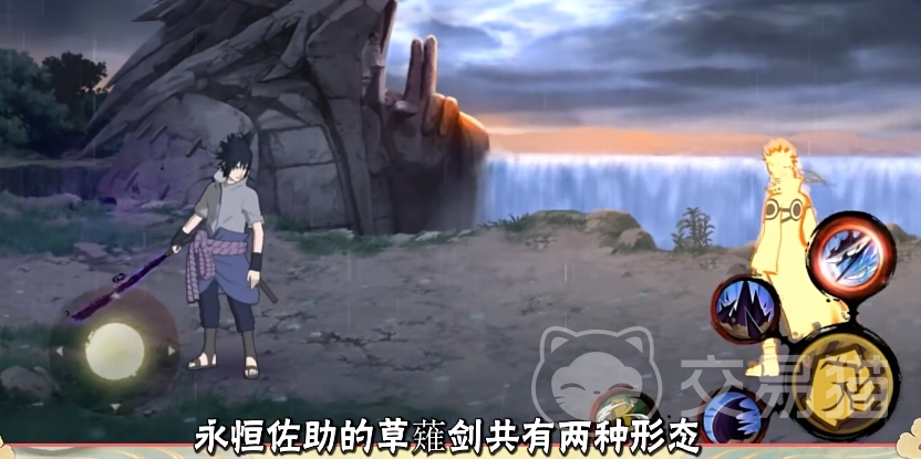 永恒万花筒佐助在游戏内是一个十分特殊的双形态角色,他可以利用手中的草薙剑来使自己分别进入“雷遁”和“炎遁”两种截然不同的形态,前者的形态下,他的武器形象和攻击特效基本都是偏向蓝色电光的风格,炎遁形态下则会变成暗紫色的风格,看上去更加邪魅。