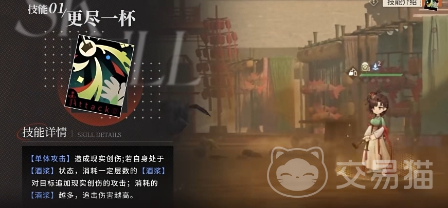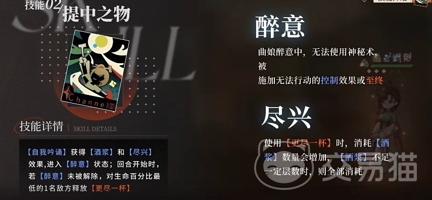 二技能的名称则是“提中之物”,其效果是通过自我吟诵来获取“酒浆”和“尽兴”两种效果,其中酒浆的效果不必多说,新增的这个尽兴状态它的效果是增加一技能所消耗的酒浆数量,因为该技能原本是有一个消耗上限的,有了它以后就可以突破这个上限,让一技能的增伤效果来到一个新的高度。