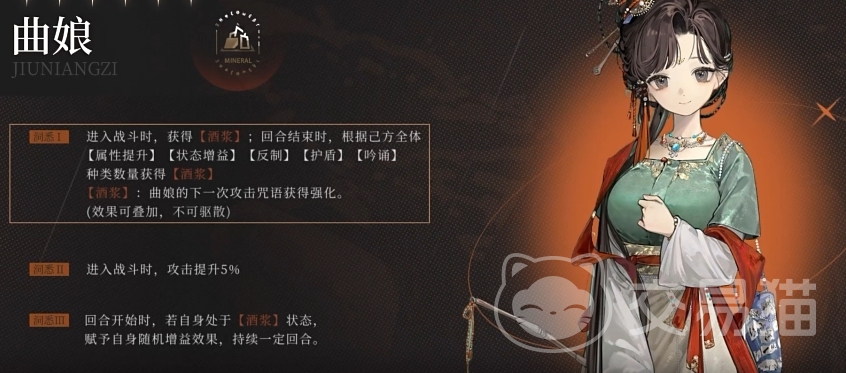 特性方面,曲娘的三种洞悉均有不同效果,首先一阶段的效果有两种,第一个是战斗开始时获得“酒浆”buff,该buff能够让她的下一次攻击周瑜得到强化,并且该强化可以不断叠加,且不能被驱散。另外洞悉1还能让曲娘在回合结束后根据己方全体的各种状态数量还获取额外数量的酒浆,所以搭配特定队伍,她的酒浆层数将迅速叠到一个十分夸张的地步。
