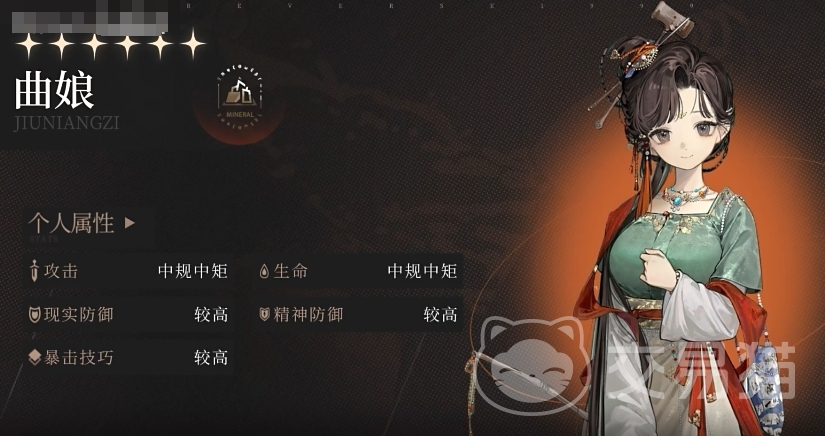 除了这两项相对普通的属性以外,曲娘的其他三项属性都很高,包括现实防御,精神防御以及暴击技巧都是非常不错的,可以让你在使用她的过程中感受到充分的坦度和爆发能力。