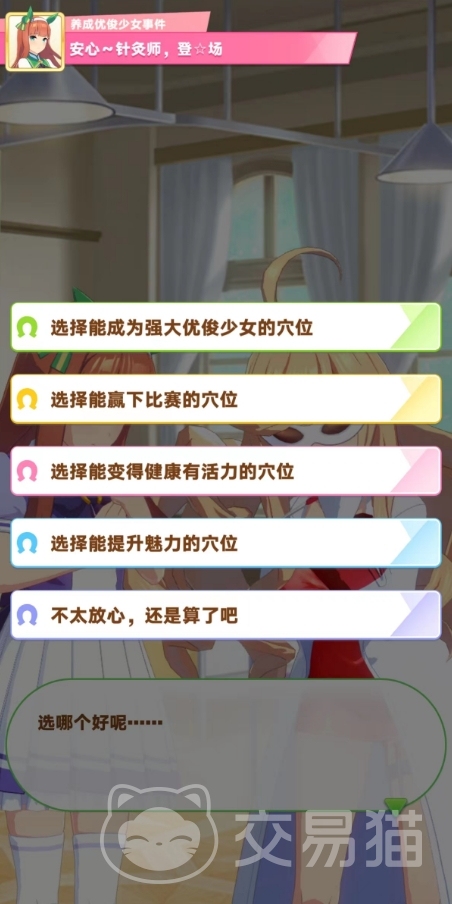其次就是打针剧情,这也是一个让人非常深印象深刻的特殊加成剧情。风险大,收益也大,五个选项当中,有四个都可以给我们带来非常大的增强收益。从技能属性到相应的练习加成应有尽有,但失败的话,也就意味着我们这局无法进行更好的养成了,重新再开。
