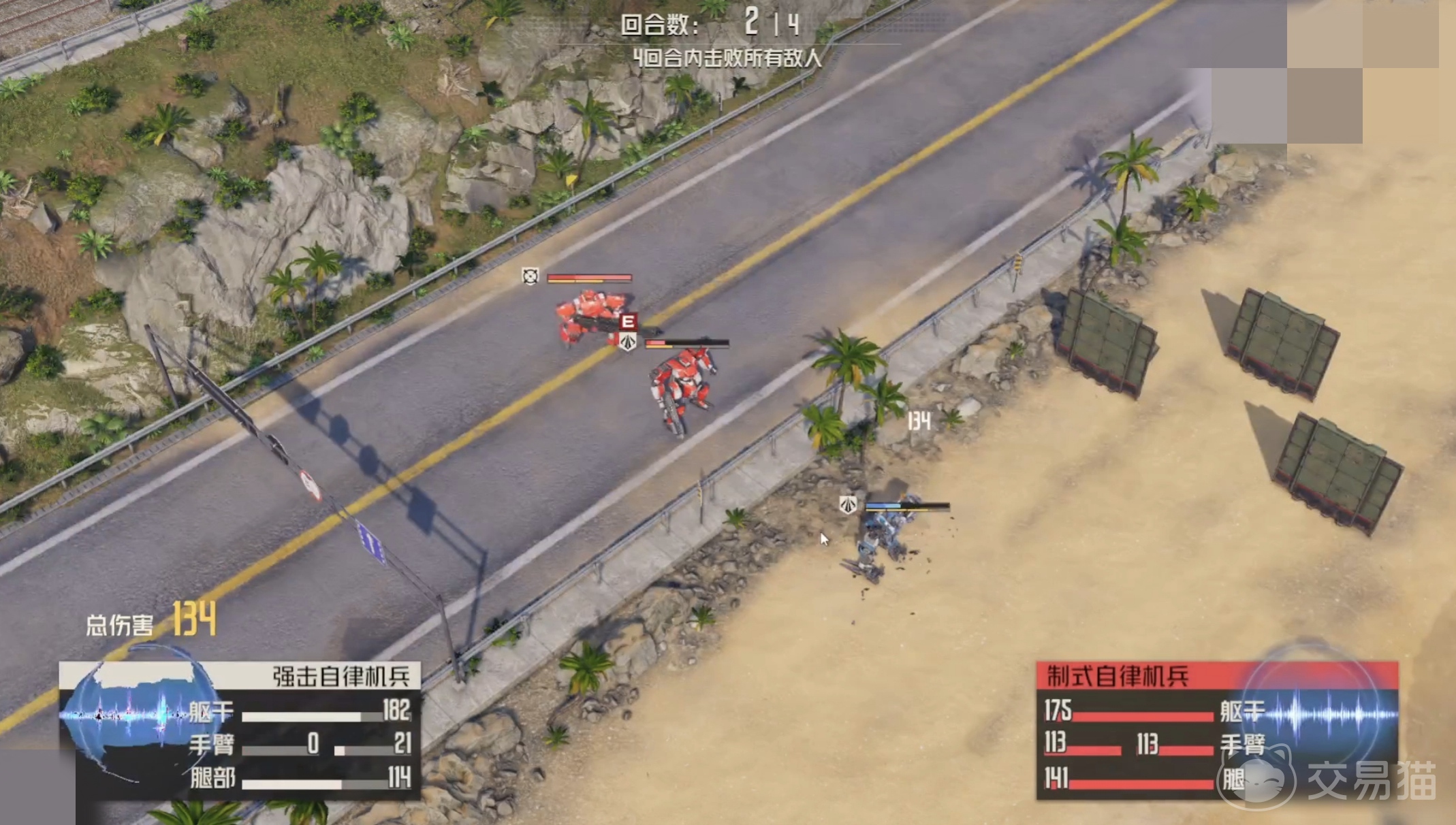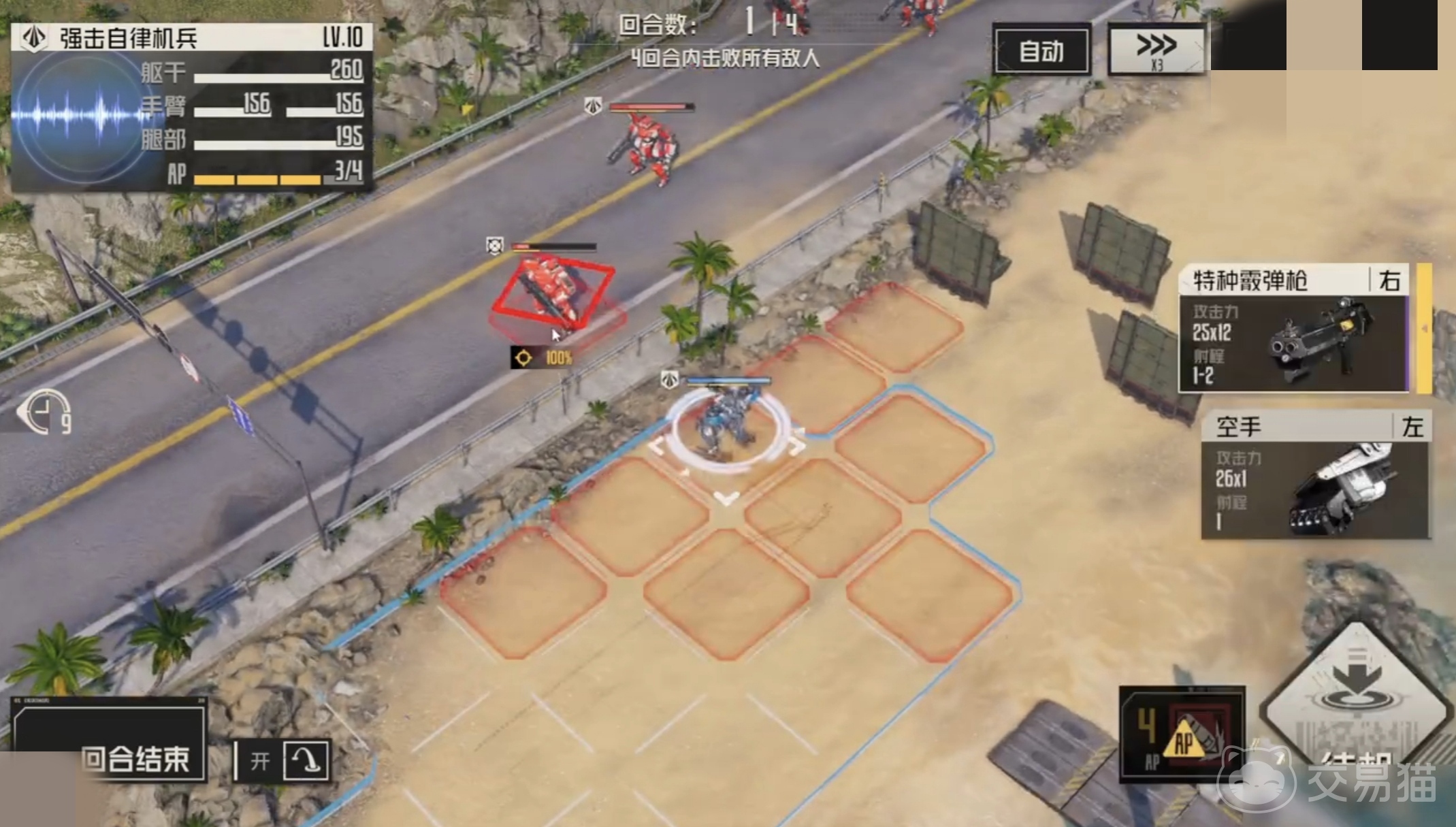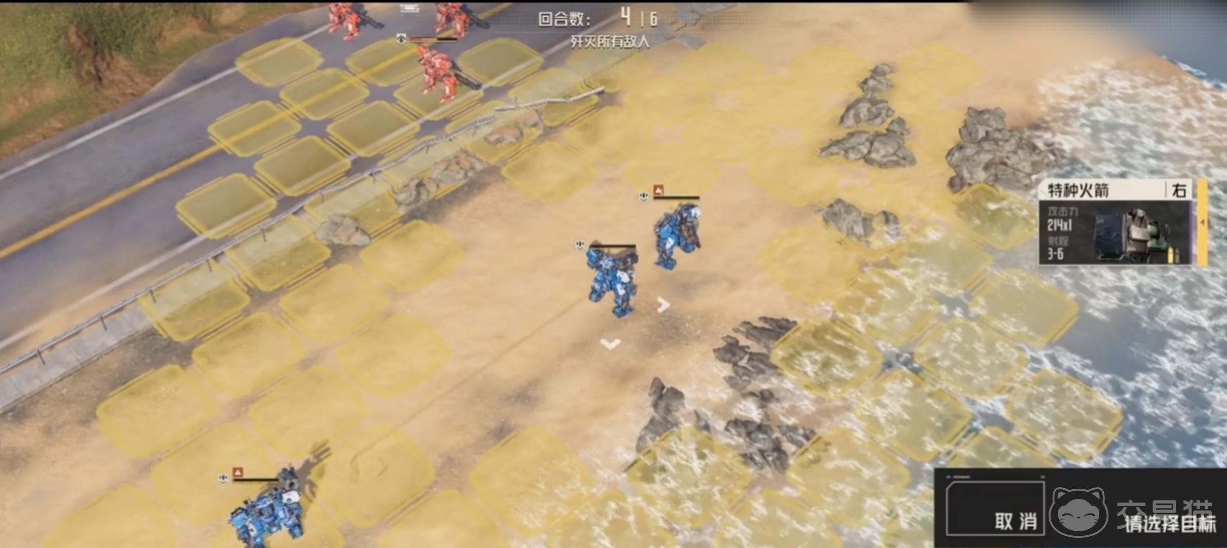 第二轮回合时,我们把远程攻击的机甲移动到敌方攻击目标的正前方,确定范围后展开导弹打击。第三轮的时候敌方四个机甲已经全部站在一起了,这时候我们移动重型机甲到他们的正前方,展开aoe范围的打击,这时候敌方四个机甲的状态差不多已经被打掉一半了。